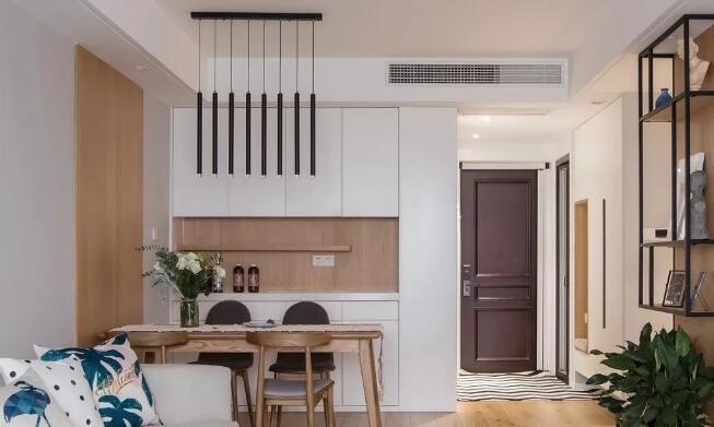 原木色换鞋凳与白色柜体对比鲜明,餐边柜外侧开向玄关,增加实用收纳功能。