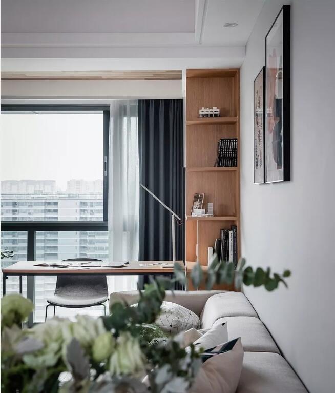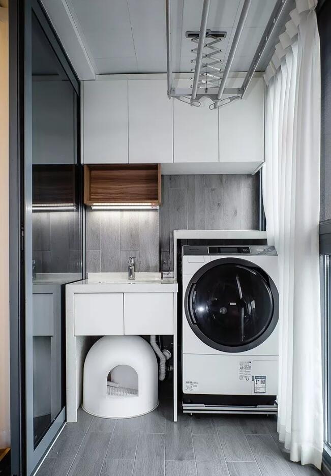 客厅阳台收进室内后,现场制作了书桌、书柜,起到隔断的作用,也增加了家里的实用功能,可以在这里办公。客厅阳台另一侧做了原木色隐形门,推开后进入生活阳台,洗衣柜下边留了猫窝,升降式晾衣杆更方便。
