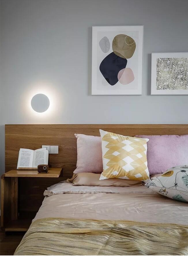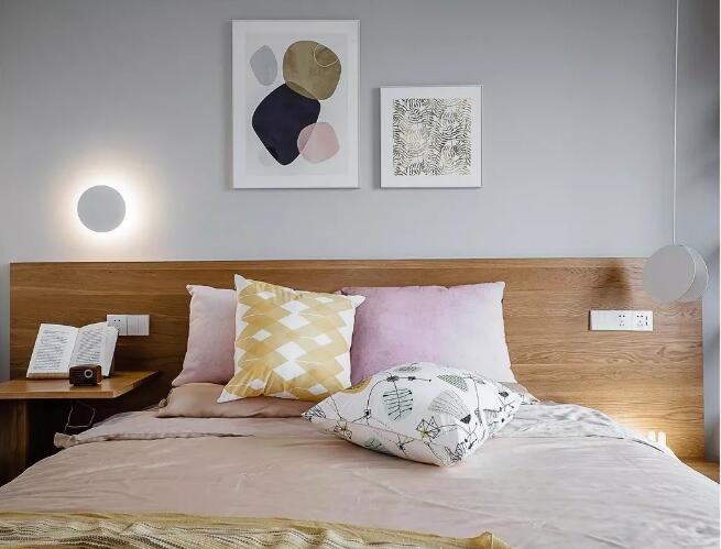 主卧床买成品靠背加长的,插座开孔安装,床头柜也包在里面更有整体感。颜值超高的圆形壁灯、金属吊灯、彩色抱枕,一点一点丰富自己的家,每一件都不是随意的拼凑。