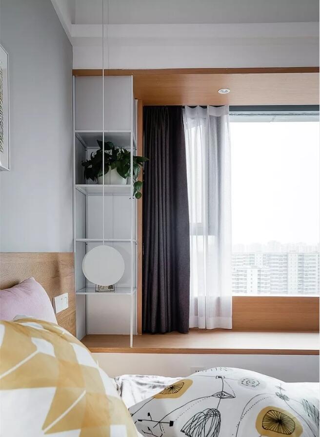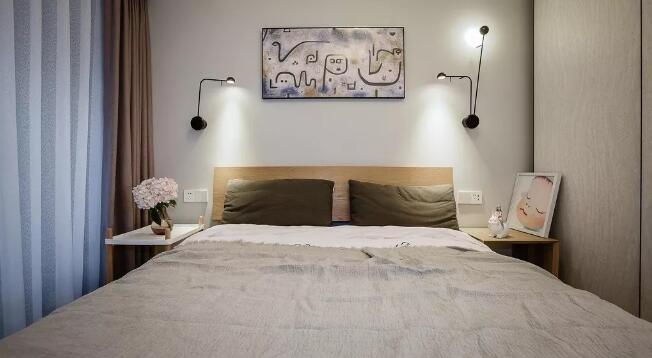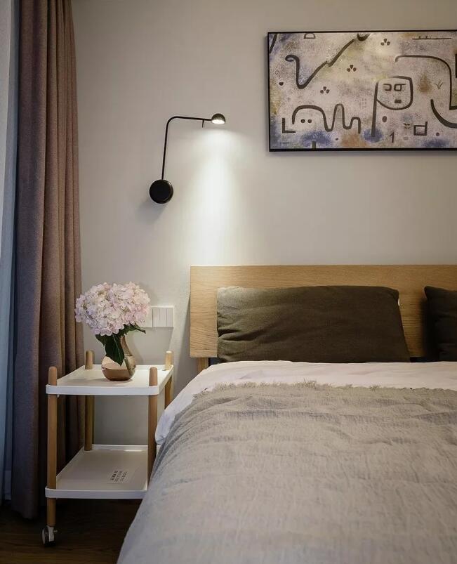 次卧简洁素雅,色调沉稳宁静,床头挂画购于国外建筑大师的画,成了次卧的点睛之笔,一切都显得和谐温暖。