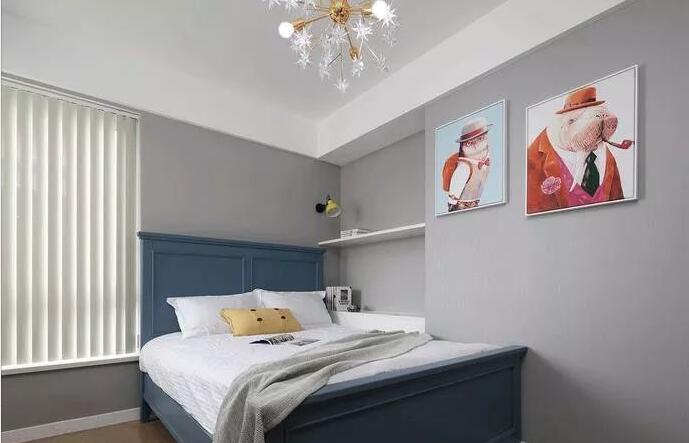 ▲儿童房墙面依旧选用灰色铺垫柔和的基调,蓝色的儿童床以及趣味挂画的选择赋予整个空间鲜活的想象力。