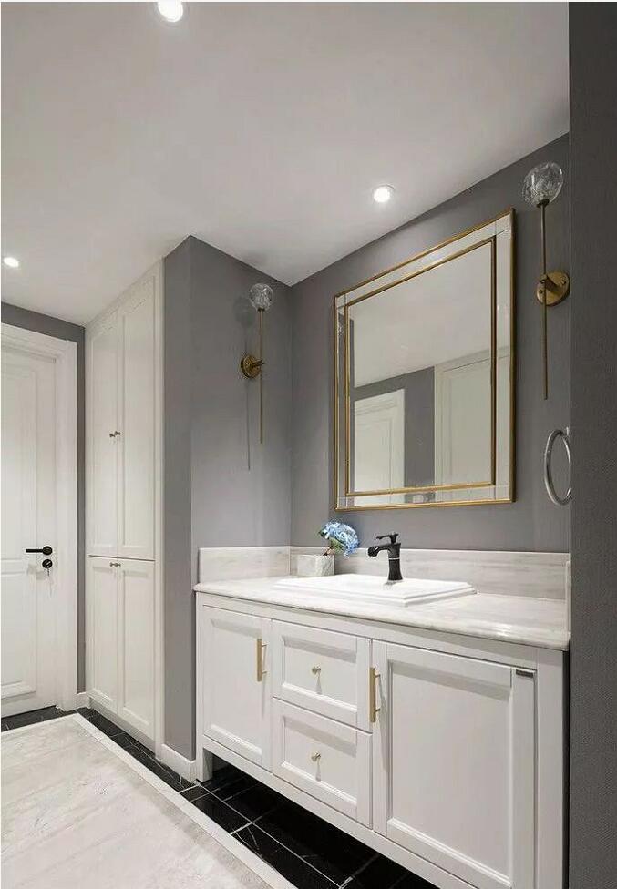 ▲卫生间灰白色调搭配简洁优雅,金色点缀突出精致感,这就是生活最完美的状态。