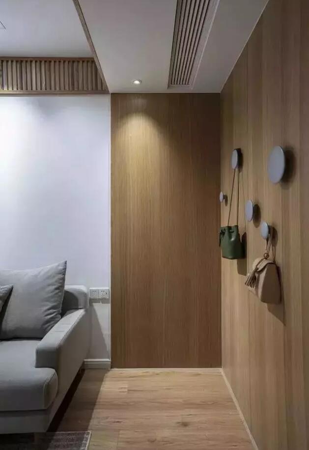 户型并不是很好,属于开门见厅布局,但是屋主很会利用空间和色彩进行隔断。玄关背景墙因为属于承重墙,所以没有办法做嵌入式,但是大型储物柜显压抑,矮柜则与客厅在风格上无法和谐搭配,因而小夫妻便干脆放弃储物柜设计,用原木装饰背景墙,打上大小不一的按钮,做挂钩,看着非常清晰素净,像钥匙手机等小物件就放在客厅的茶几上,倒也很方便。