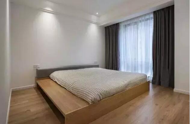 宽敞的主卧抛弃了很多没有必须要用的家具,更显清爽大方,超宽敞的原木卧床,特意留出一边,既充当床头柜用来放置手机等小东西,同时,也是二哈的床,两人一狗就这样和谐的躺在一起,窗帘是深灰色,拉开的时候,能让整个卧室充满阳光;拉上后,就是一个充满安逸安全静谧的睡眠空间。