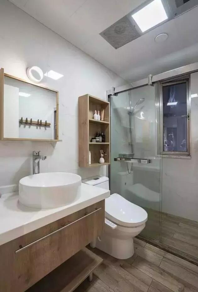 卫生间比较小,依次分布洗漱台、坐便器和洗澡间,用玻璃门做干湿分离,白色搭配原木色,简朴而又自然。