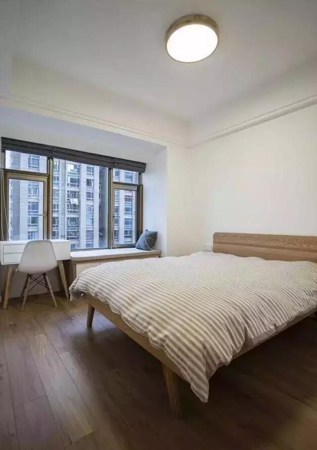 次卧也是非常素雅耐看的,同时融入了生活实用性在其中,原木卧床搭配灰白条纹床品,时尚而大方自然,临窗做了一番改动,将飘窗咋去一半,放入书桌书椅,用于办公,另一边是充当躺椅,金属色镶边,更有格调。