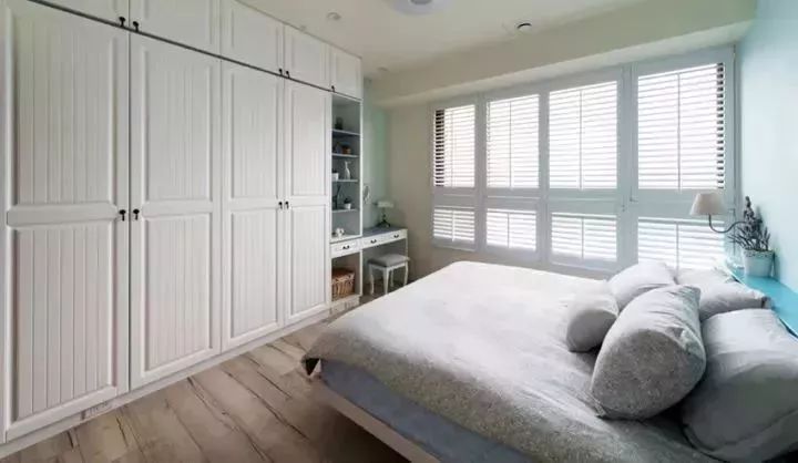 将衣柜和梳妆台设计为一体,既节省了柜子分别设计的费用,还能统一颜色风格,提高整体一致性,打造出明亮舒适又实用的卧室空间。