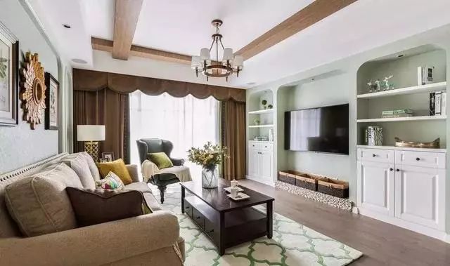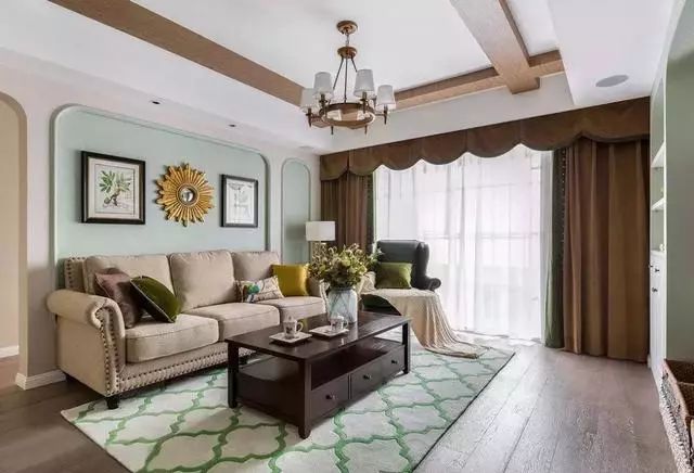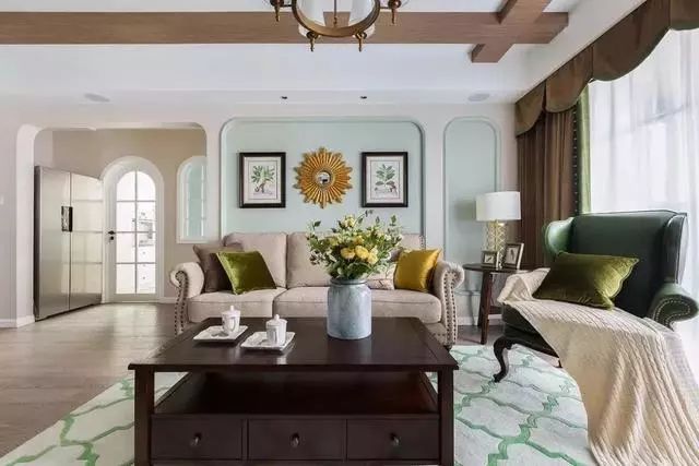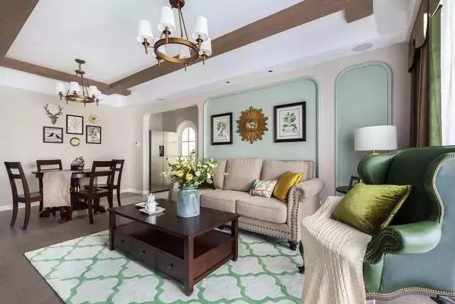▲客厅整体以薄荷绿色和米色做为主色调,沙发整体颜色也和背景墙色调相,薄荷绿色的墙面搭配卡其色的布艺沙发清新自然相得益彰。茶几整体选择枣红色实木家具,很符合美式风格。墨绿色单人沙发临窗而立,优雅复古而不失品质感。