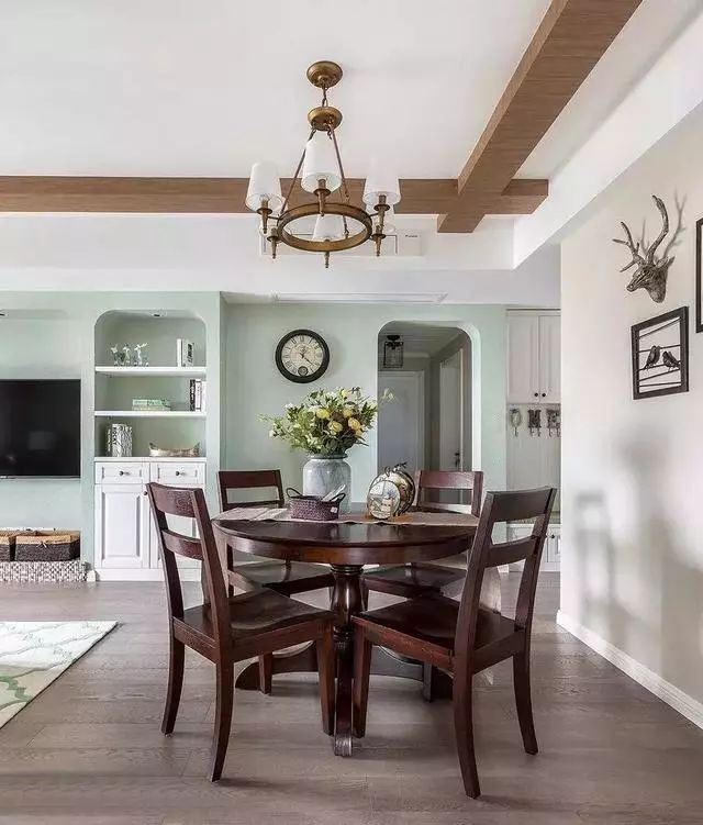 ▲餐厅选择了和客厅茶几一样的枣红色实木圆桌,圆形木桌会让人在就餐时更加放松,亲密度也更好哦~木质圆桌典雅有格调,桌上放置一盆花卉,使餐厅生机盎然,让人感到舒心。