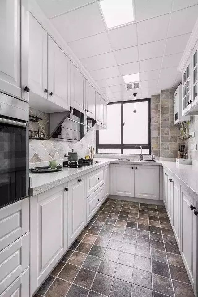 ▲U型厨房扩大了空间的整体感觉,整体白色背景搭配白色大理石让厨房更加干净整洁。空间收纳井井有条,墙地面使用仿古砖,把厨房铺出个性化的效果。