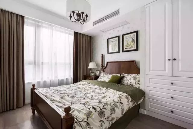 ▲次卧则是选择了棕色的美式家具、绿色的床品、卡其色搭配白纱的窗帘,走的还是清爽和温暖路线。