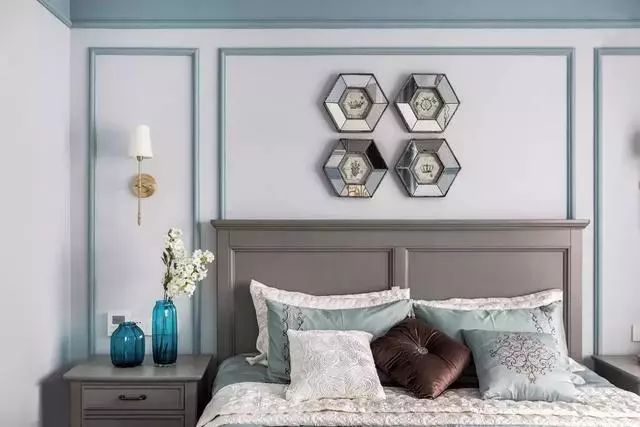 ▲主卧则选择了不同于客厅和书房的背景色,选择了浅灰色来作为主卧的主体色。浅灰色让人身心更加沉稳。精致的墙饰提升空间格调,雅致舒适的床品营造温馨的睡眠空间。