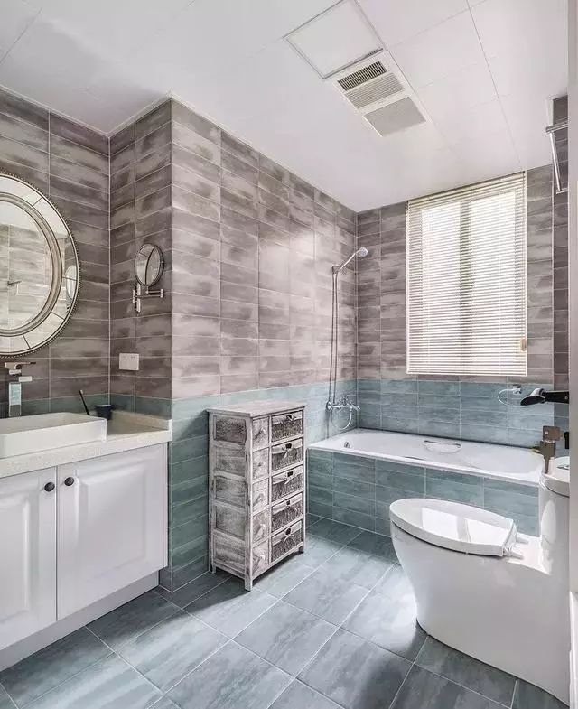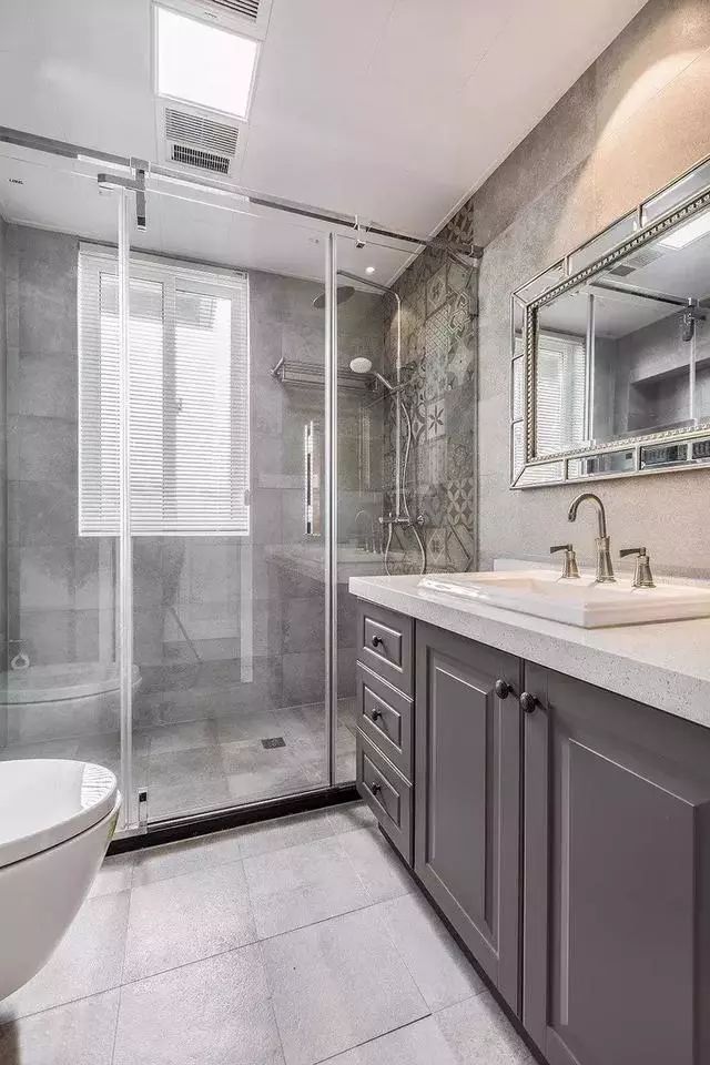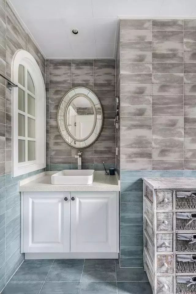 ▲次卫采用蓝灰色的仿古砖结合,呈现出舒适的色调以及独具风格的空间感觉。主卫设置了淋浴隔断,灰色的卫浴柜搭配白色的台面,低调简洁。