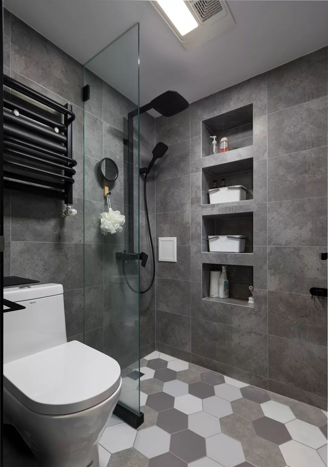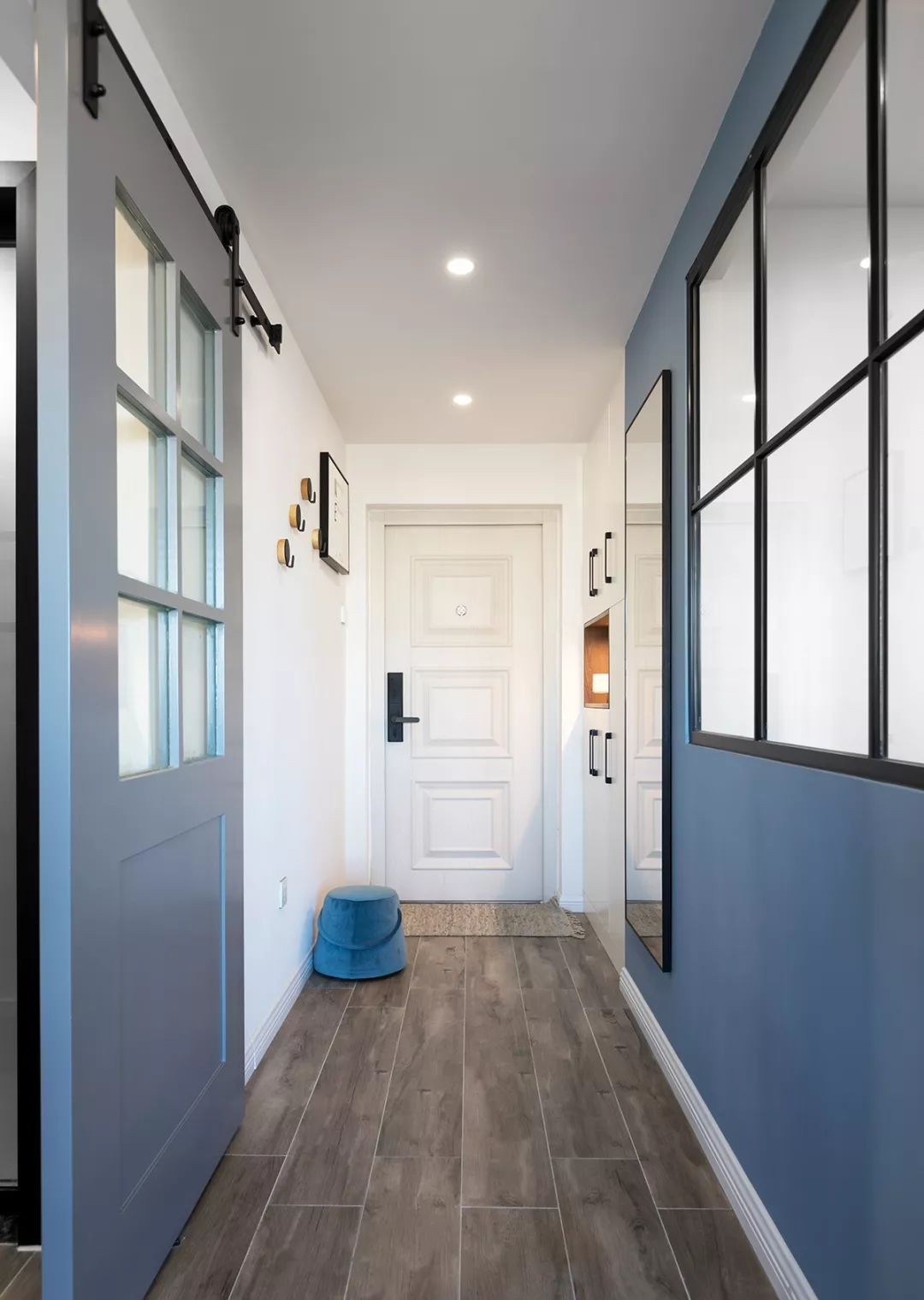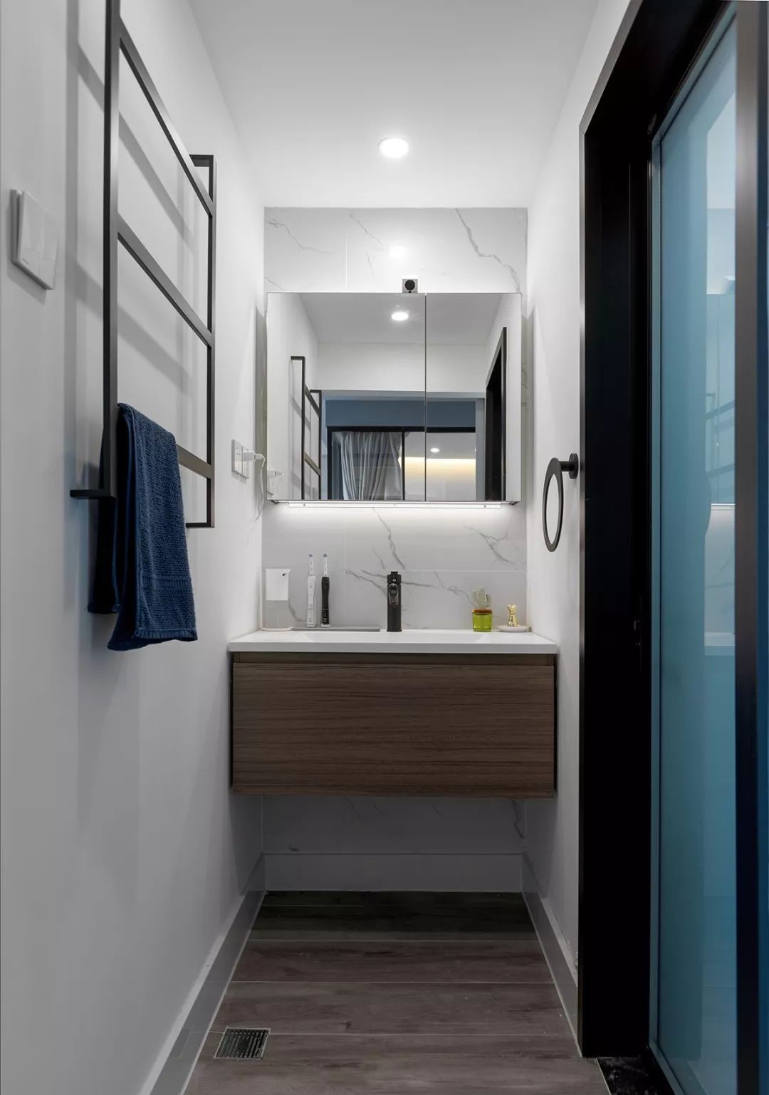 进门右手边就是卫生间,一扇蓝色谷仓门与玄关过道相隔。推开谷仓门就是洗手台,实现卫生间干湿分离。