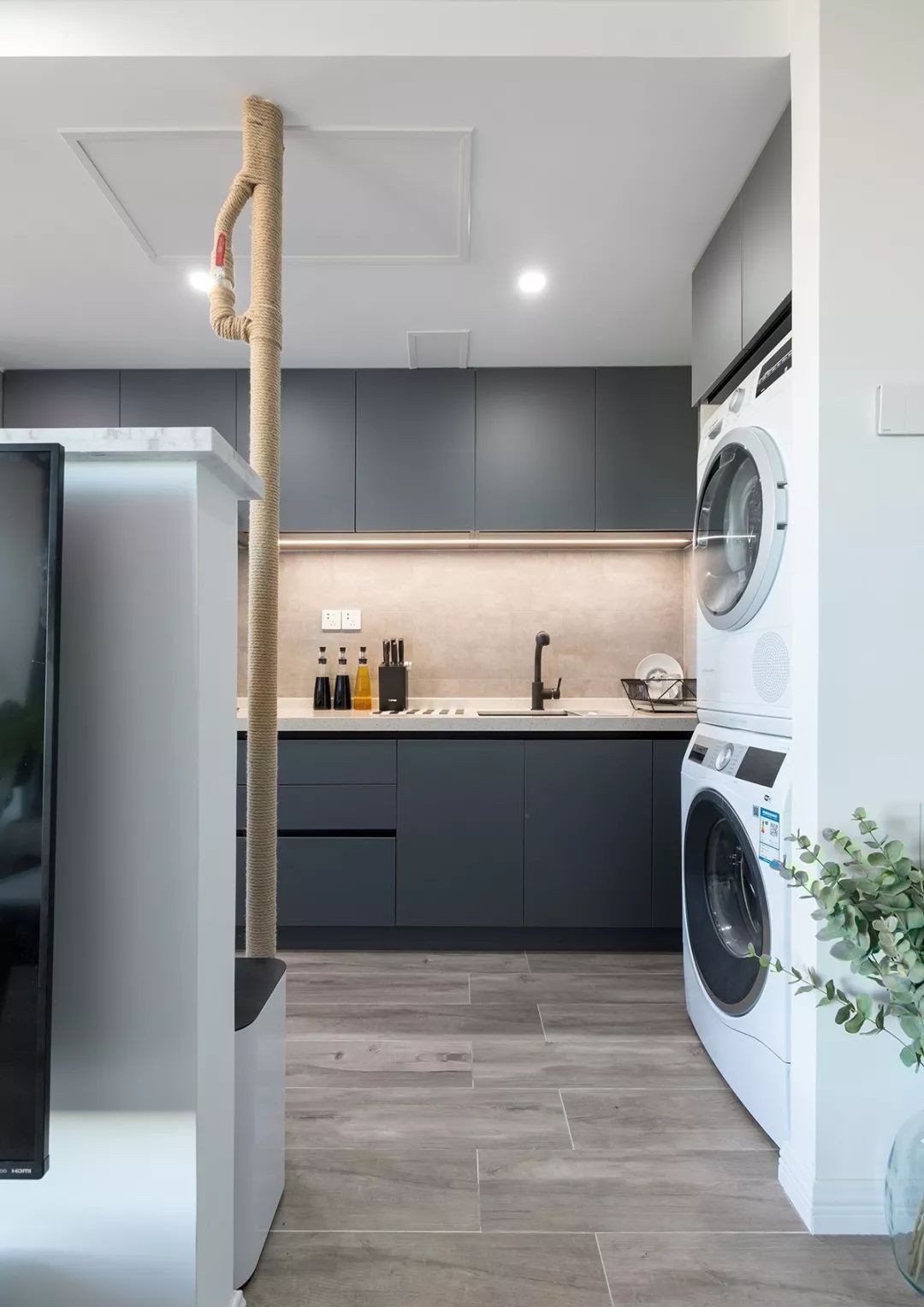 厨房橱柜整体选择深灰色,不怕脏的同时让厨房变得更加具有现代感和时尚感。电视柜背面做了个小型吧台,平时小两口和孩子吃饭,空间完全够用。把洗衣机跟烘干机全部融进厨房里,空间利得非常充分,一点也不浪费。