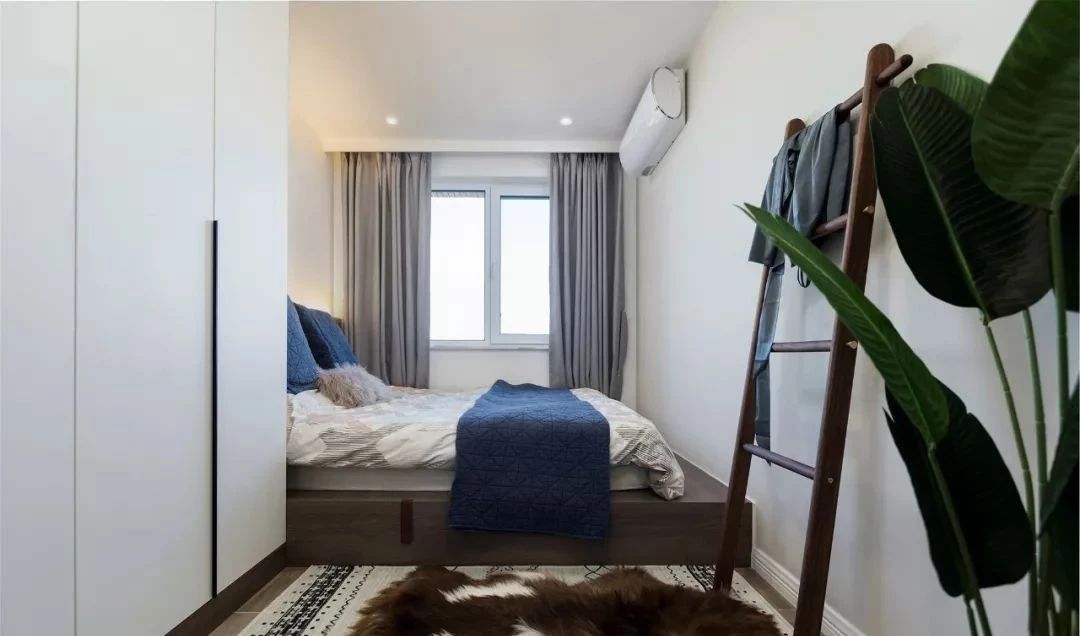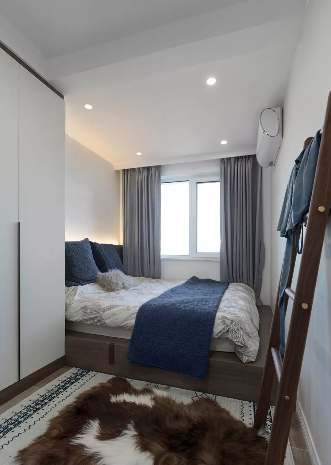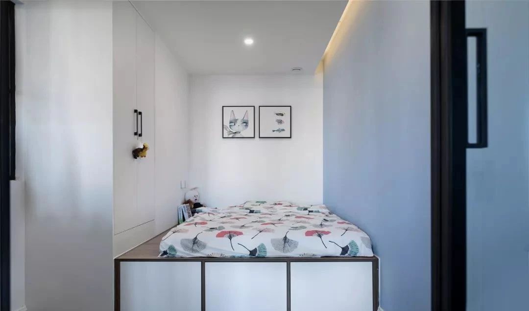 原本卧室空间太小,储物空间严重不足,放床有死角,难看又尴尬。专门定制的双人床,与衣柜衔接起来,实现空间上的0浪费。