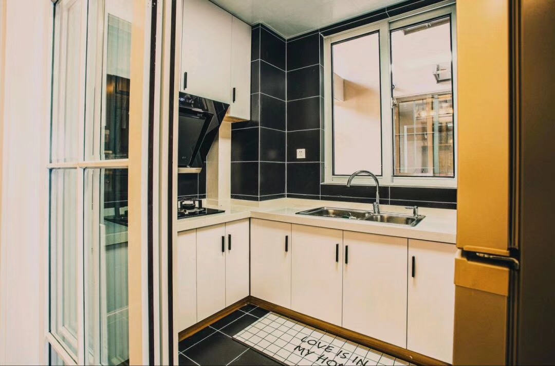 厨房以黑色墙砖为基础,是现代时尚的体现,白色的橱柜门板更显奢华时尚。