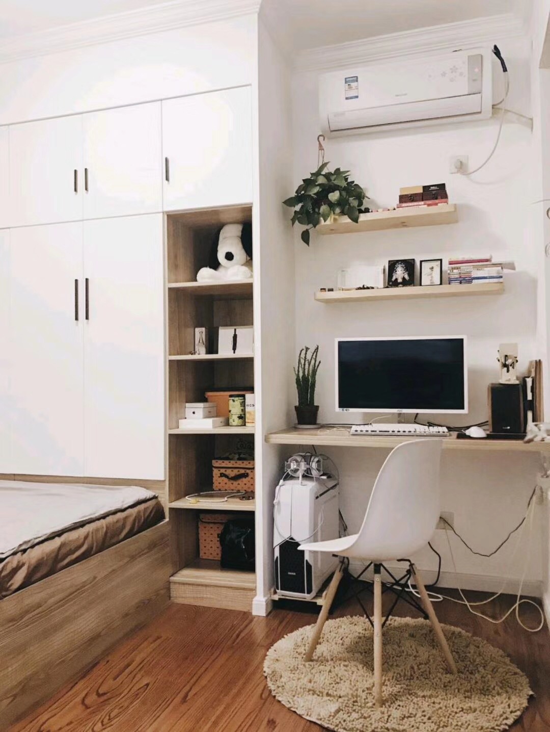 卧室布置较为温馨,作为主人的私密空间,主要以功能性和实用舒适为考虑的重点,空间用的淡咖色的墙漆,温馨柔软的床,简单柔软的木地板达到了温馨舒适的效果