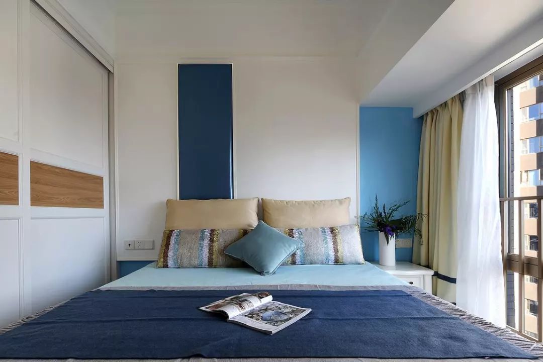 主卧室选择了蓝色作为主调,背景墙的蓝色装饰和床品交相呼应。床头柜背景墙却选择浅色调的蓝色,一深一浅相得益彰。卧室简单的布置就提升了整个空间轻松舒适的氛围感。