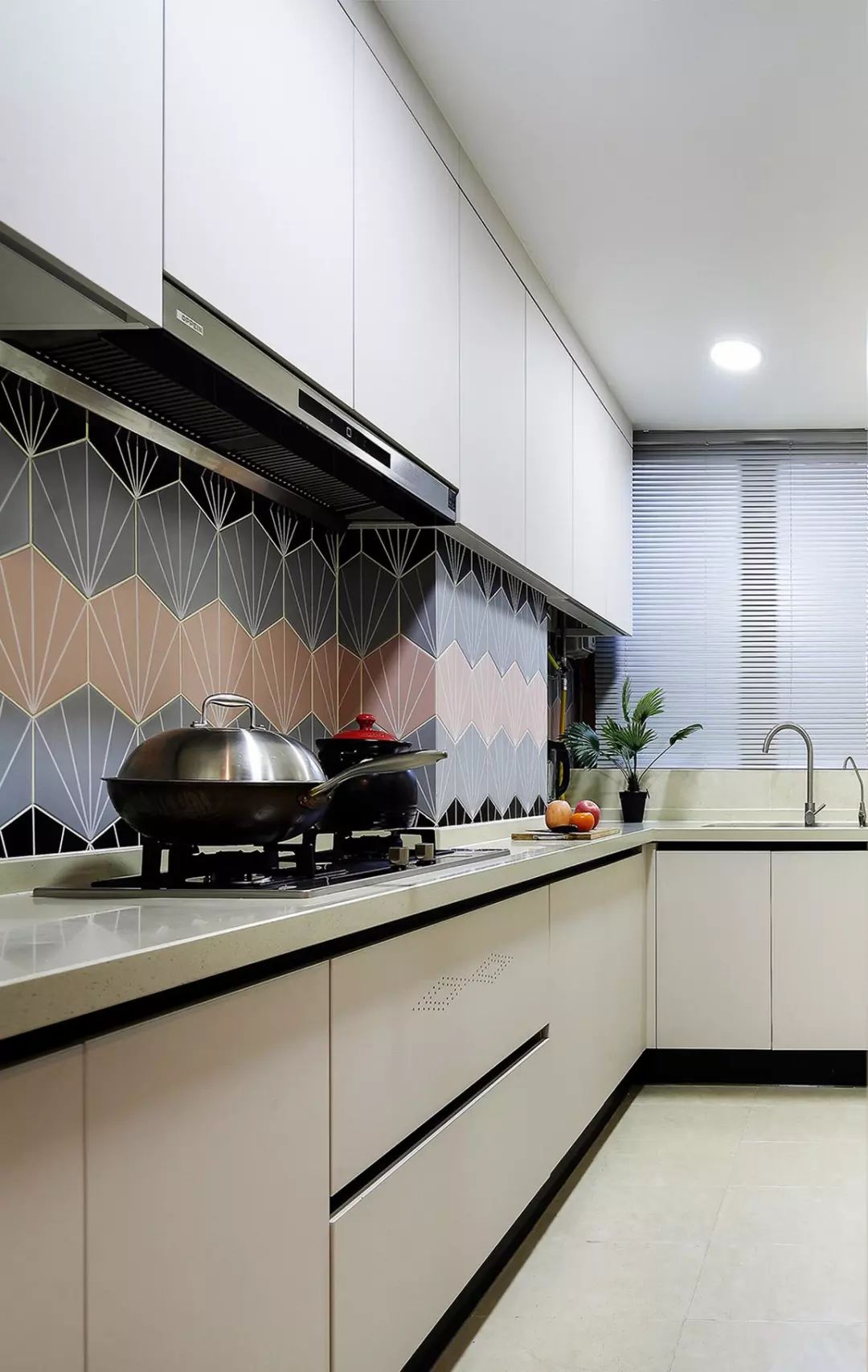 厨房内部是做了L形的橱柜,整体以白色为主的厨房空间,显得简单而又明亮。橱柜中间充满时尚感的彩色六边砖作为整个厨房的点睛之笔。