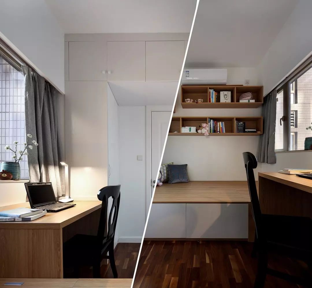 书房搭配了一个榻榻米的地台,上方的置物架更好的有利于存储。书房整体选择深颜色的原木色调,作为办公学习的地方最需要的就是静下心来。配合白色墙面和柜体简约又自然。
