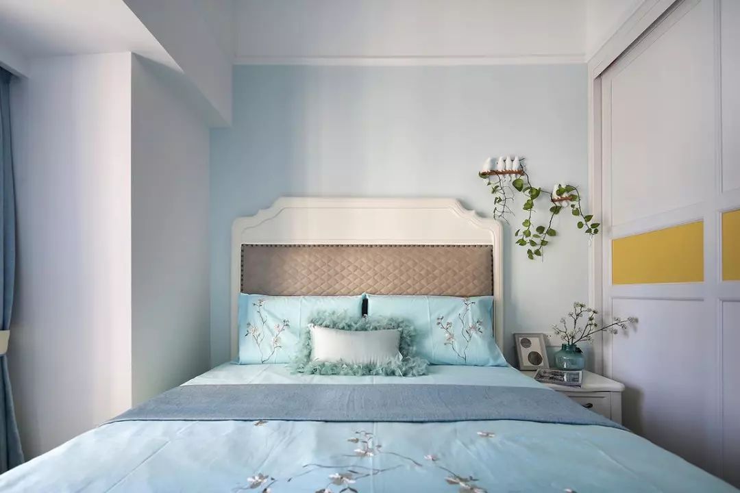 儿童房的背景墙选择了小朋友很喜欢的淡蓝色,充分满足小朋友对于大自然的喜爱。在背景墙上加了绿植和小鸟作为装饰,童趣感满满。再配合白色的衣柜和床,房间又充满了清新。