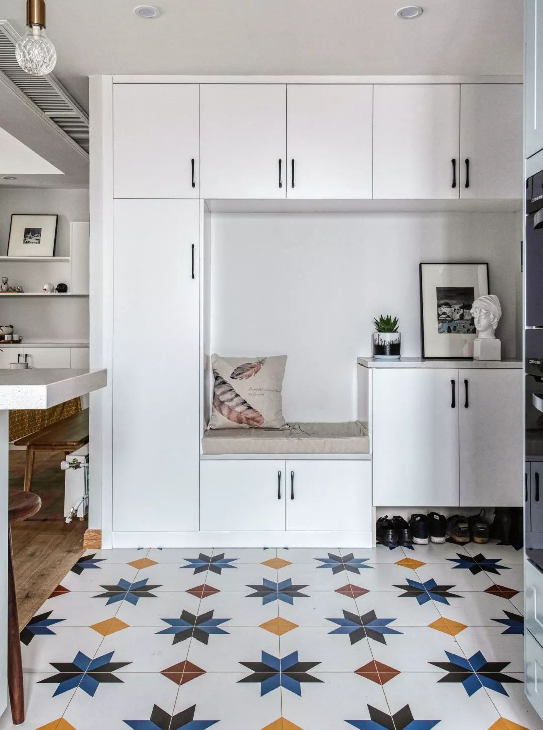 入户的玄关走廊处就铺贴了花砖,充满创意的花砖让人一进门心情就会变好。嵌入式的鞋柜做到了顶部,中间留出了作为换鞋凳的位置,摆放日常杂物非常方便。