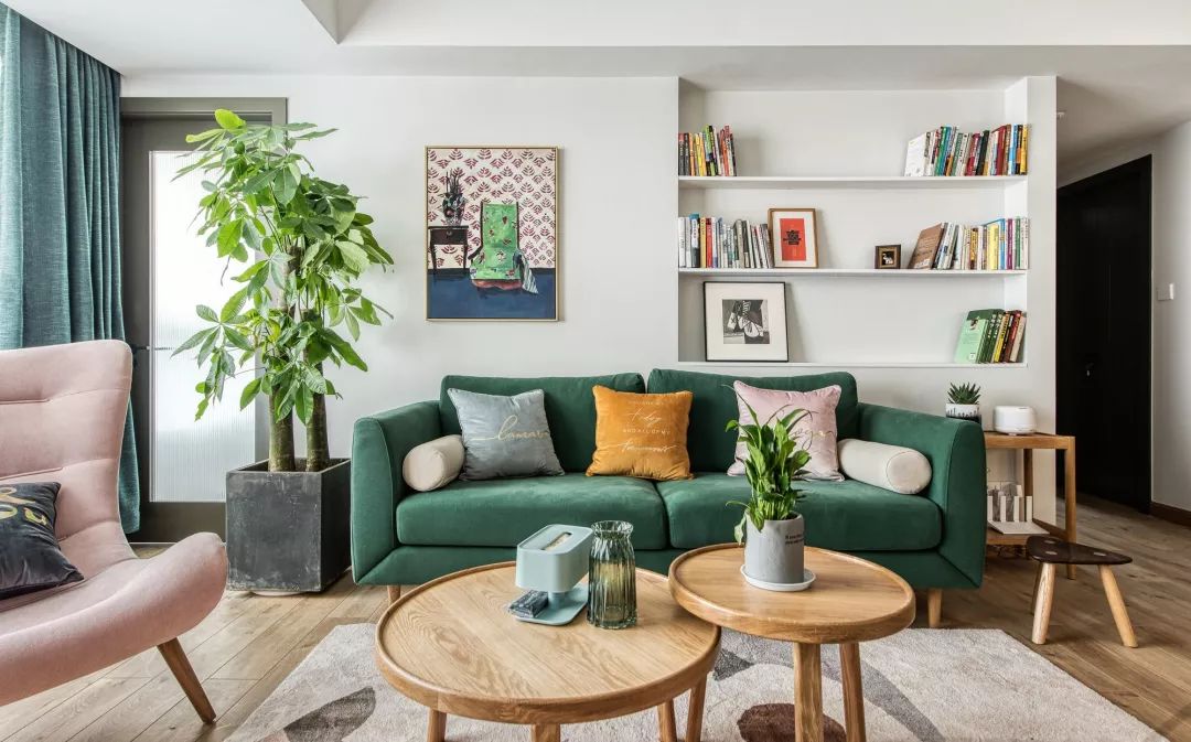 客厅的颜色搭配非常丰富,粉色撞色墨绿色的沙发再配合白色背景让整个客厅空间不会突兀反而却更加清新舒适。原木桌椅让空间温馨感更强烈了。