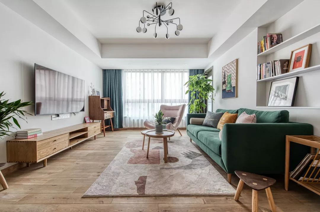 客厅的电视背景选择了留白,让视觉停留在颜色艳丽的沙发上,主次分明。沙发背景墙也做了嵌入式的壁龛设计,用于摆放书籍和挂画,不浪费一点空间,实用感大大增加。