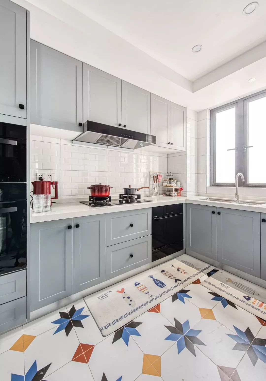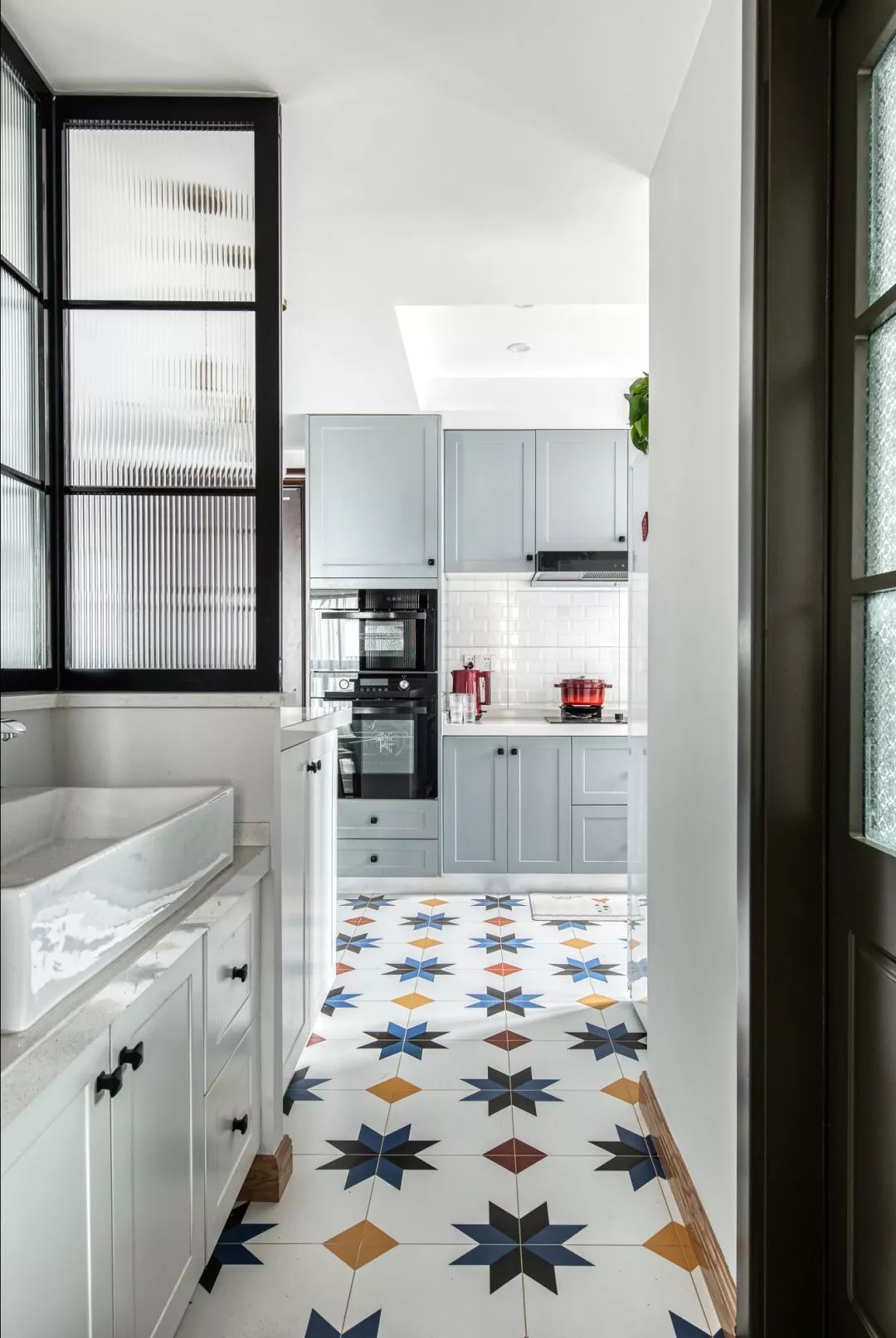 厨房在玄关的另一侧,地面也铺贴了同样的花砖。这套橱柜的颜色是现在很火的雾霾蓝,看起来很有质感,业主对于这个颜色也是非常喜欢。