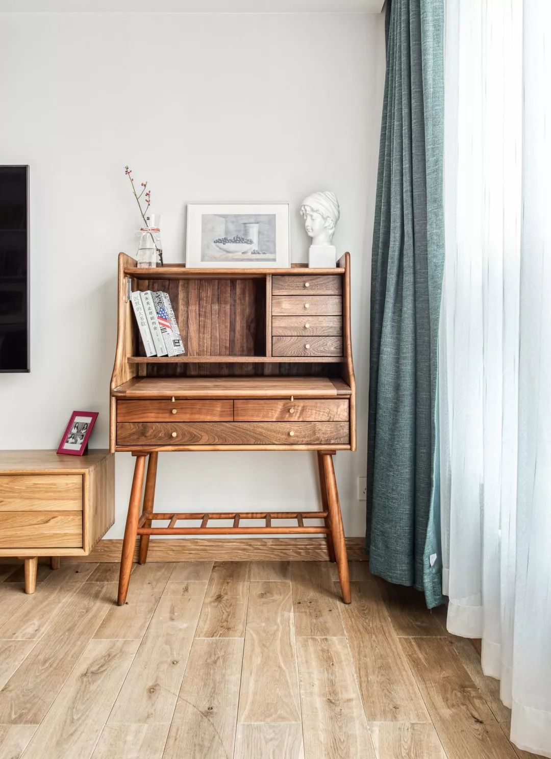 复古的斗柜书架搭配原木色的电视柜,给客厅带来了一丝文艺感。多种收纳方式结合起来,杂物再也不用担心无处可放啦!