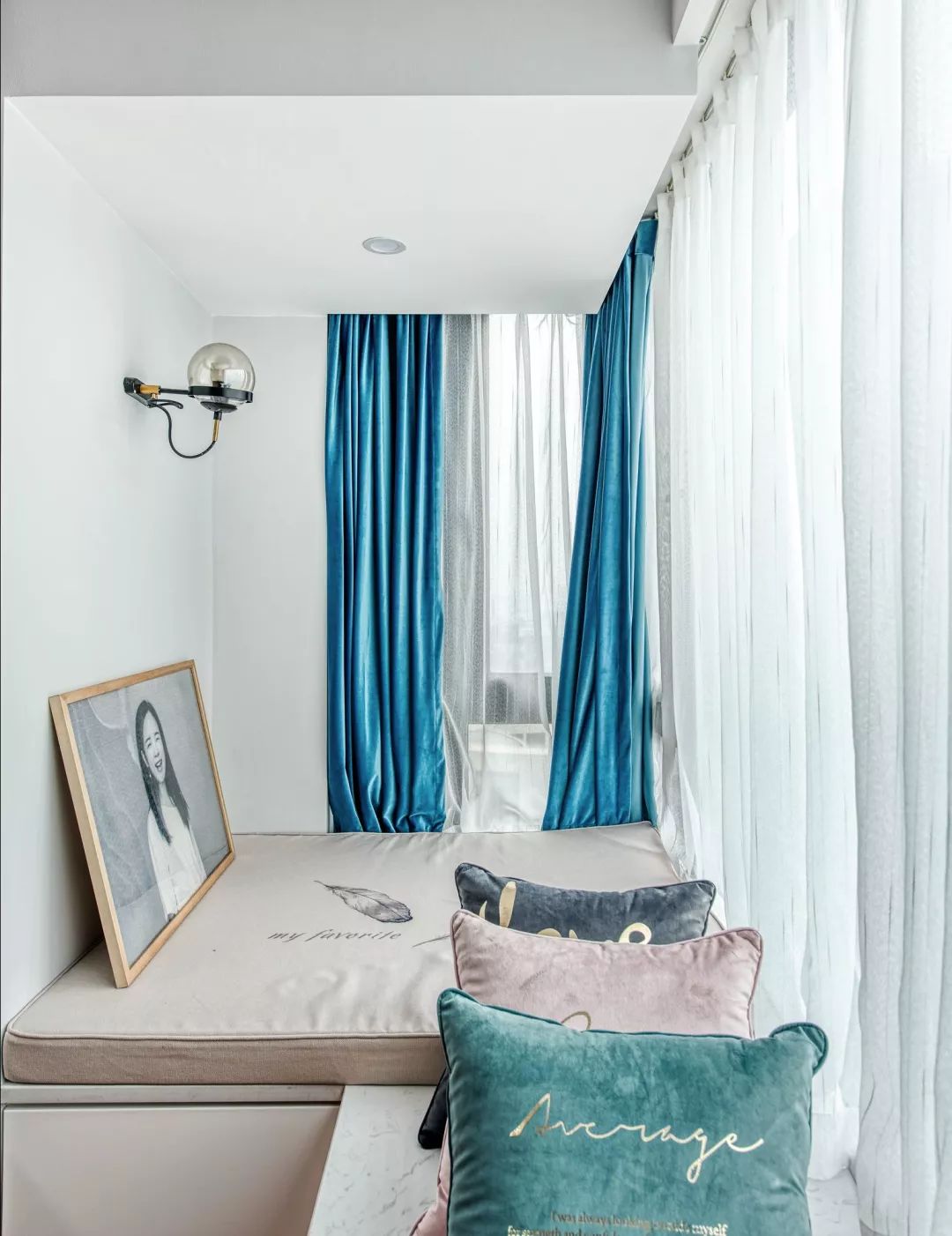 主卧室里面有一个让人羡慕的飘窗台,可以轻松打造出一个惬意而又舒适的休闲区,搭配抱枕垫子真让人羡慕。