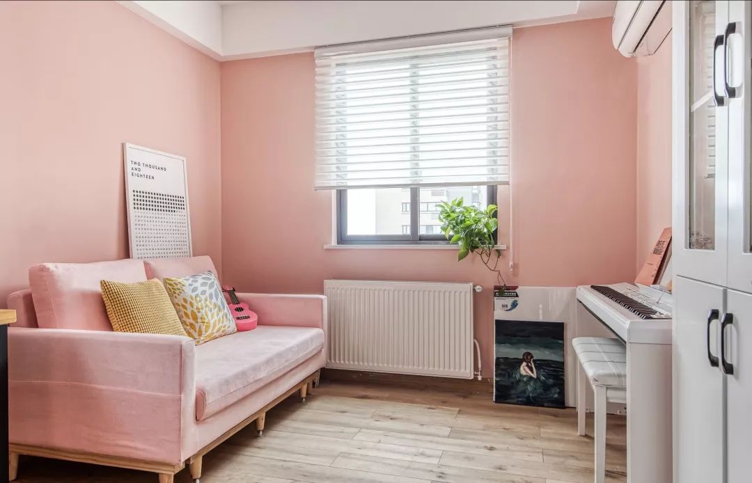 书房作为休闲区来使用的,通体粉色的背景和沙发显得优雅而又浪漫,书桌、书柜和钢琴的结合,把书房作为了一个多功能区。