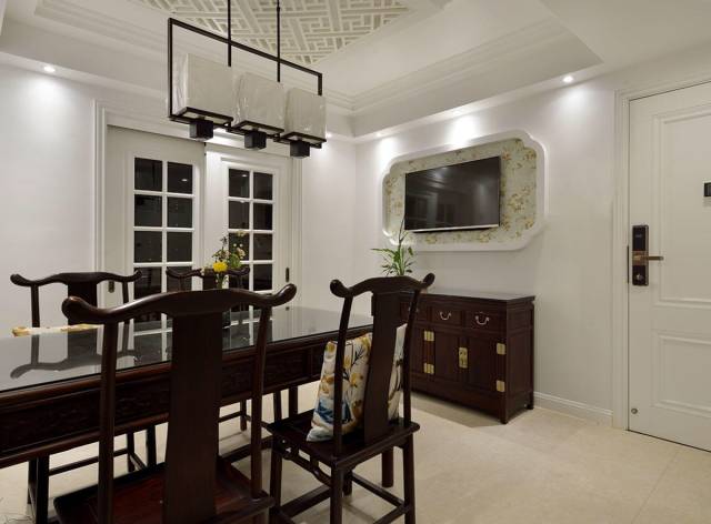 ▲餐桌的另一侧墙面做了一个中式造型的电视背景框同时搭配同色系的餐边柜,看着这个餐边柜是不是很像以前大户人家的的柜子呢~