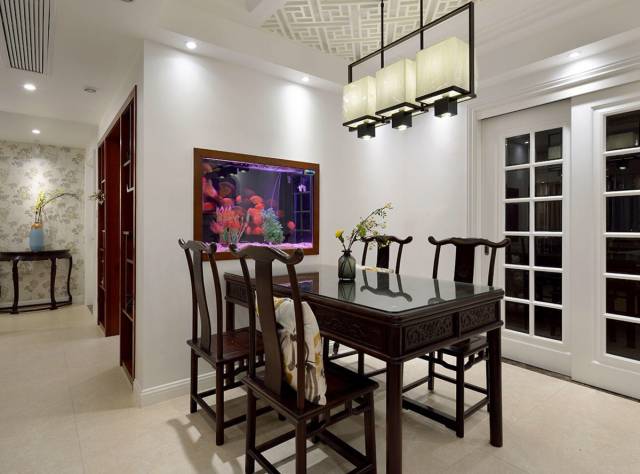 ▲餐厅中式雕花的餐桌搭配官帽椅,古典的气息一触即发。墙面做了嵌入式的鱼缸,就餐的同时会让人感到心情愉悦。