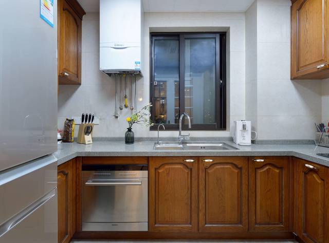 ▲厨房做了实用的U性,大理石台面配合实木橱柜看起来非常高级。上下两侧的橱柜对于收纳来说是完全够了。
