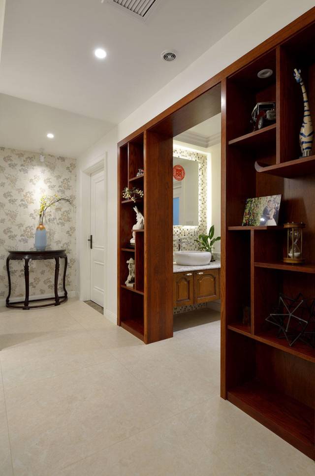 ▲卫生间外侧的墙面以多宝阁作为隔断,让整个储物空间更加宽阔。