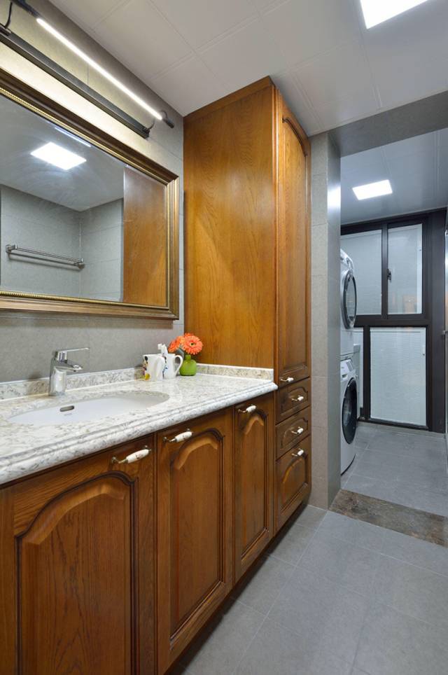 ▲卫生间的浴柜也做了很大一部分,完全不用担心收纳空间不足。碎花的大理石洗手台台面看起来十分富有奢华感。洗衣机和烘干机靠墙而放,从而节省空间。