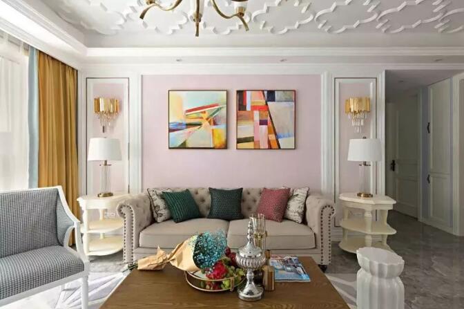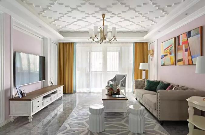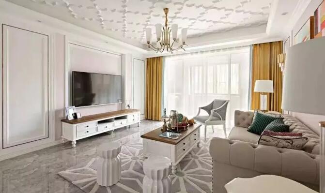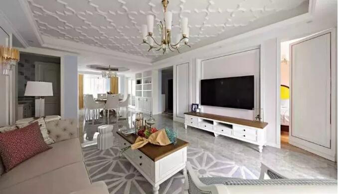 客厅吊顶做了花纹设计,一抬头还以为看见了云朵呢。客厅吊顶真的是满满的美式气息啊。电视背景墙选择了石膏线作为装饰,配合白色柜体木质桌面的电视柜更加有格调,而旁边的卧室门也选择了隐形门,真的是小心机呢。