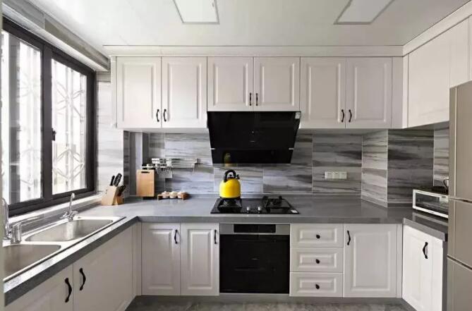厨房设计的超级简洁,灰色花纹瓷砖搭配着灰色大理石台面显得高端大气上档次!上下两侧的橱柜也满足了日常需要。宽敞的厨房各功能区设计足以满足日常烹饪美食的需求。
