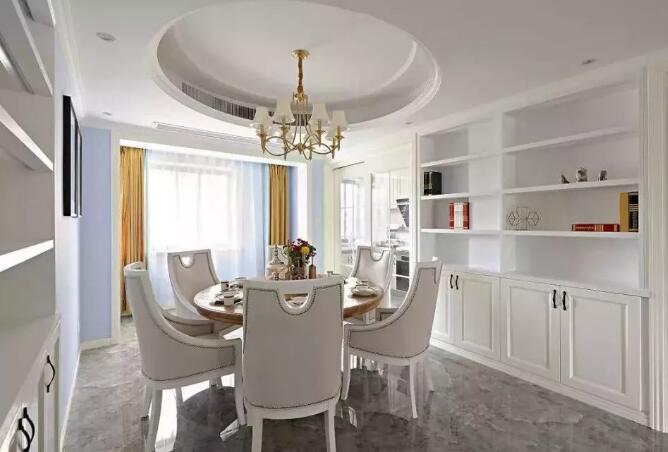 小编比较喜欢餐厅吊顶的设计,圆形餐桌与吊顶呼应,内置的中央空调也被遮挡在吊顶里,美观又不占地。圆桌的设计让人和人之间的亲密度都大大提高了,重点是采光超棒,用时餐心情也会变得美美的。餐桌旁的餐边柜储物能力也超强,为它打call!