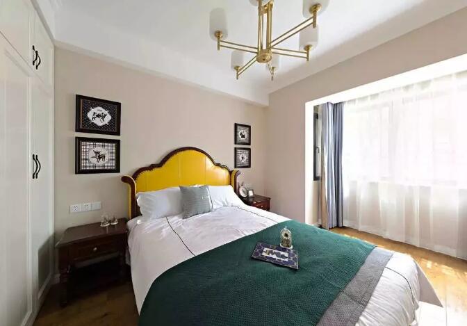 次卧打通了阳台空间,空间也变大了许多,亮黄色的床头让整个房间增添了一抹亮色,趣味性也变多了。
