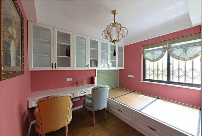 书房大胆选择了粉色作为主色调,一个房间满足多种功能,既能当书房也可以作为休闲娱乐区。就算是来客人了也完全不用怕。