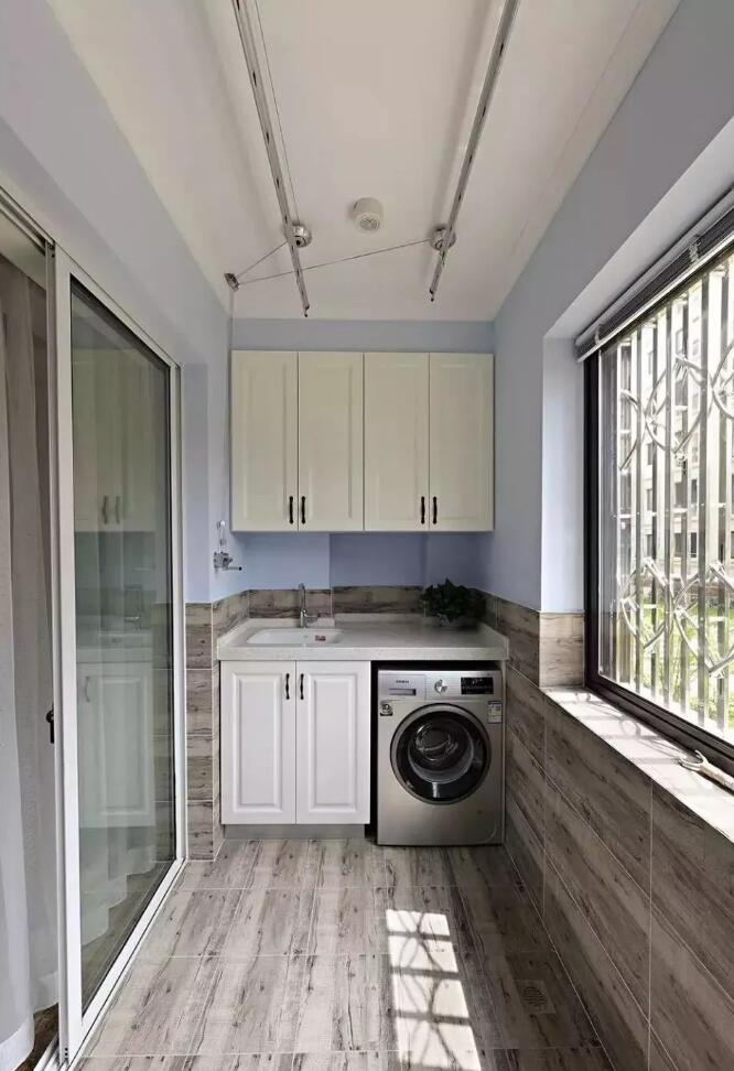 设计师把洗衣机移动到阳台,把阳台作为一个专门晾晒衣服的区域,做了智能晾晒衣杆,平常晾晒衣服也会方便很多。木纹砖的选择很有自然清新感。