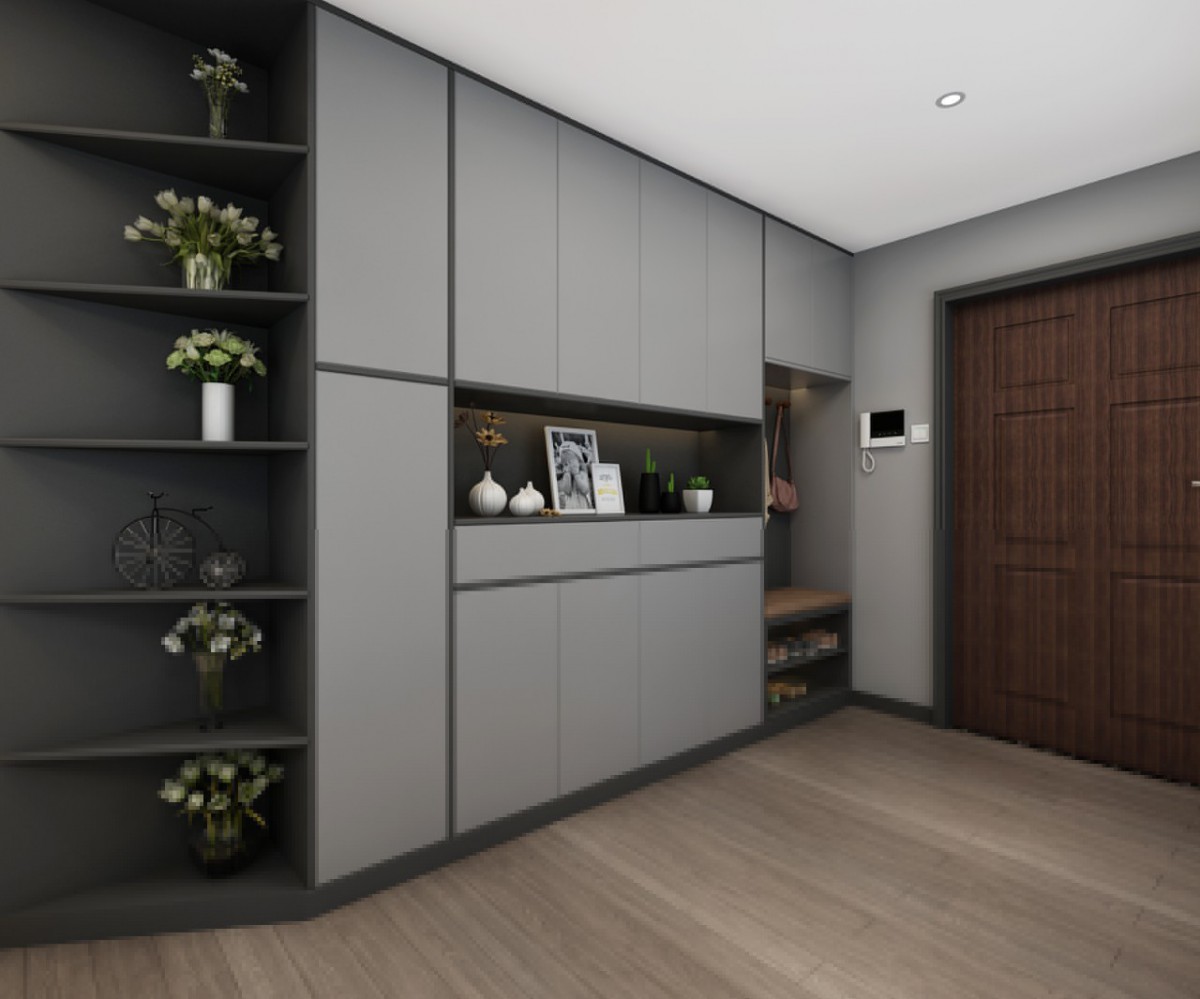 门厅处的入户柜整体嵌入在墙面上,和墙面浑然一体。留出充足的空间作为换鞋柜的区域,中间留空也为随手放置杂物留足了空间。转角处也做了很好的斜角处理,避免了直角柜日常的碰撞。提高了美观程度,小小的入户玄关也不容忽视。深灰色的柜体也是现代时尚感的体现。