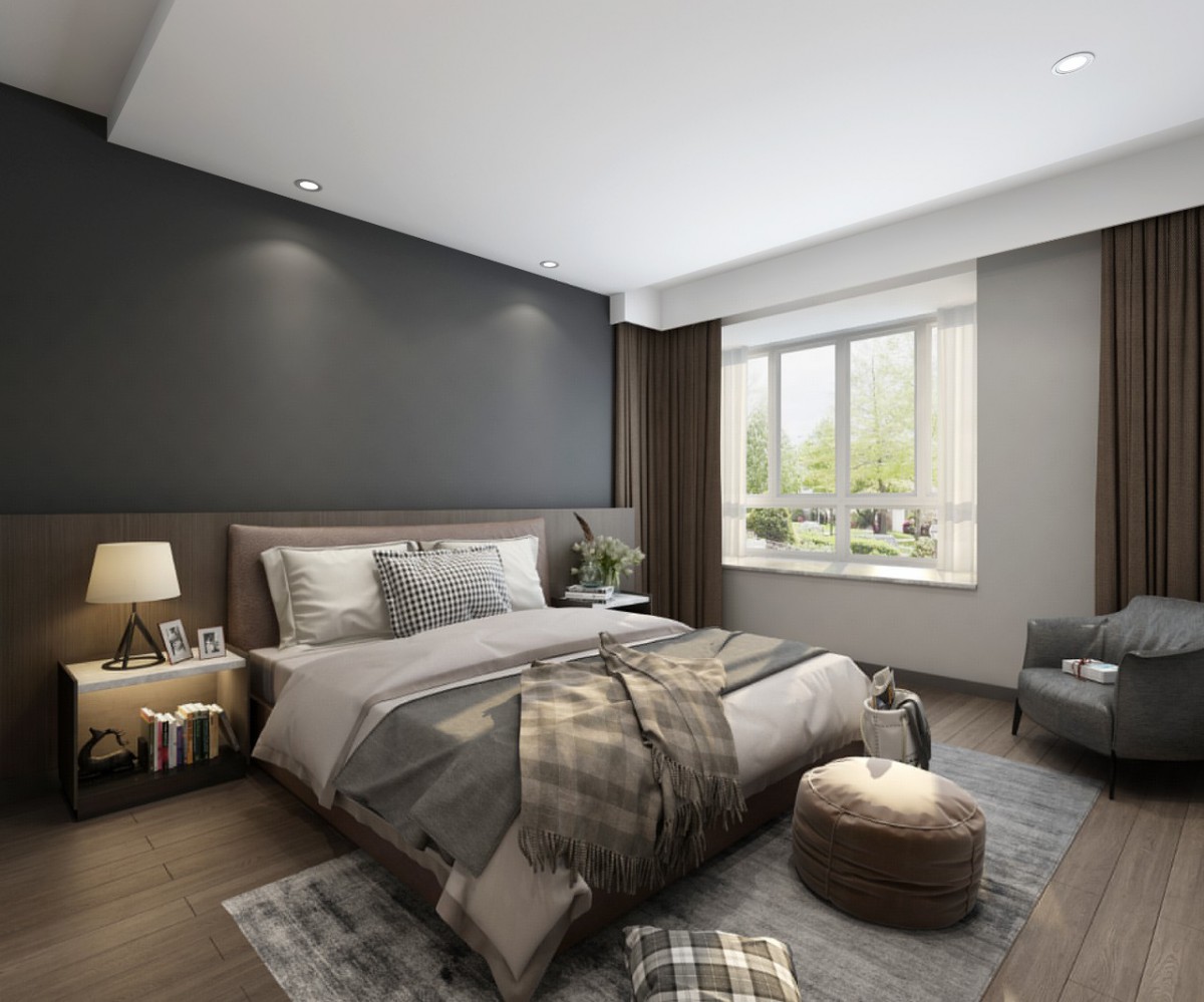 主卧整体的布局比较大,搭配了许多作为休息的沙发让整个空间的舒适性更好。整体颜色也选择了舒适简洁为主的棕灰色调,庄重中透露着对生活的安心。深灰色的背景墙,给人很好的睡眠环境,搭配棕色系的木质地板,再配上浅灰色的地毯,让人非常的想要睡觉呢~