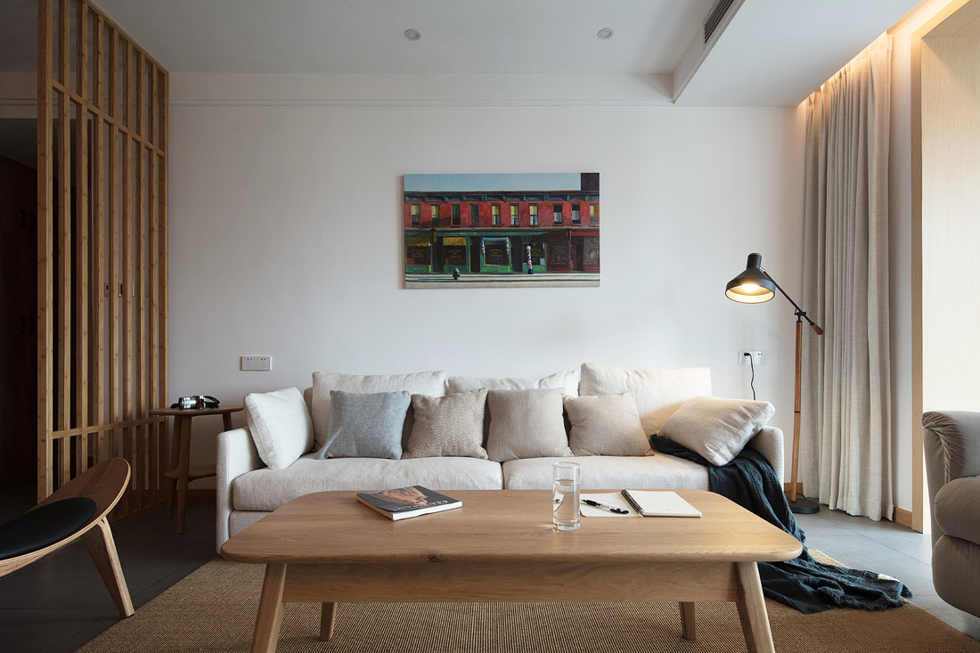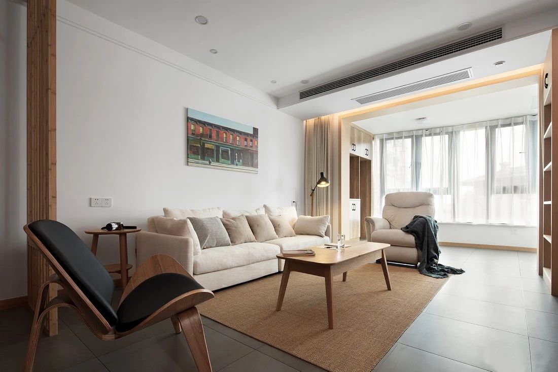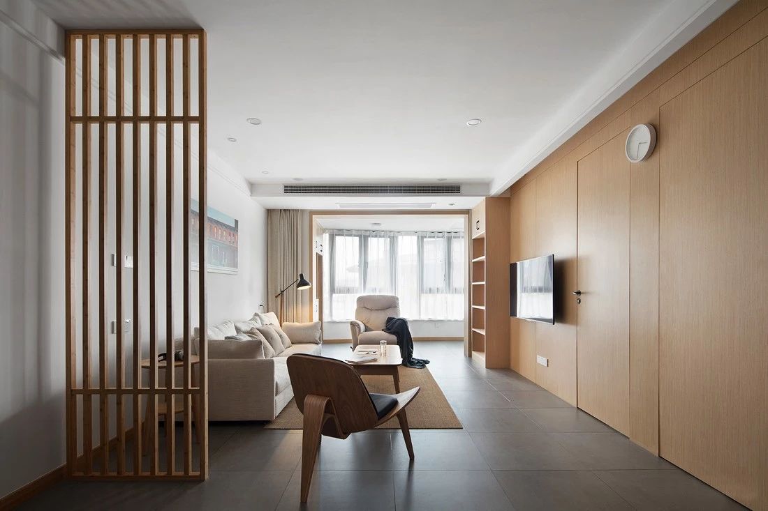 ▲客厅和餐厅之间选用了原木色的隔断很有日本的风格。沙发整体选用了米色布艺沙发,搭配灰色地砖和木质电视墙整体呈现出一个干净整洁让人舒适的客厅空间。茶几也是客厅特色之一,原木小方桌矮腿的设计是不是很像在榻榻米上呢?