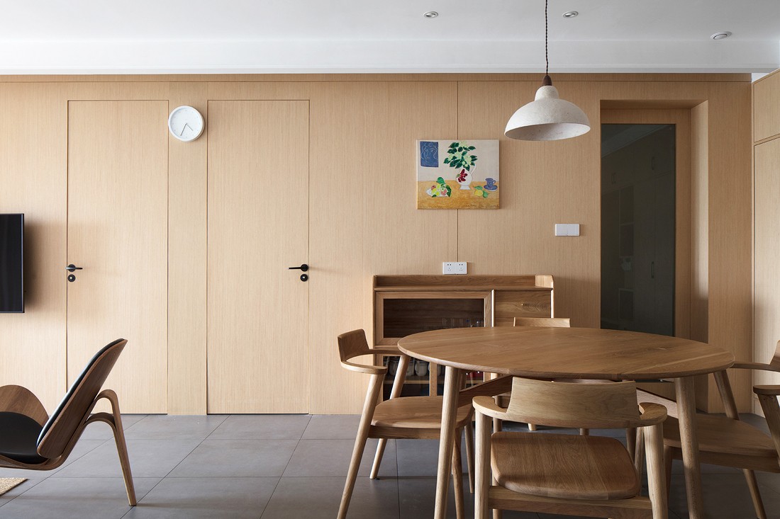 ▲餐厅的背景墙选择和电视背景墙统一,在空间上延展性更好,扩大了空间使用感。餐桌椅的颜色和背景墙做到了统一色调,整体性更好,圆桌让人更感亲密。客厅的照明以无主灯设计,在光线的层次上做了很细腻的处理。餐厅整体空间显得更加简洁大方。