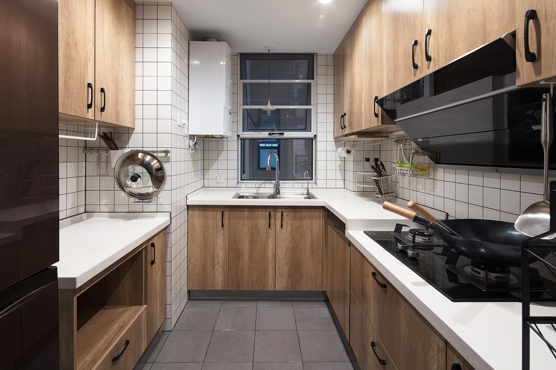 ▲看到厨房的一瞬间是不是会感到很有文艺气息呢?地面铺设灰色地砖搭配着木质橱柜白色台面在搭配着白色小方砖,再小的厨房也不会显得拥挤啦!墙面上选择了挂式放置架,充分利用了空间。使用感也更强烈层次感也更丰富。