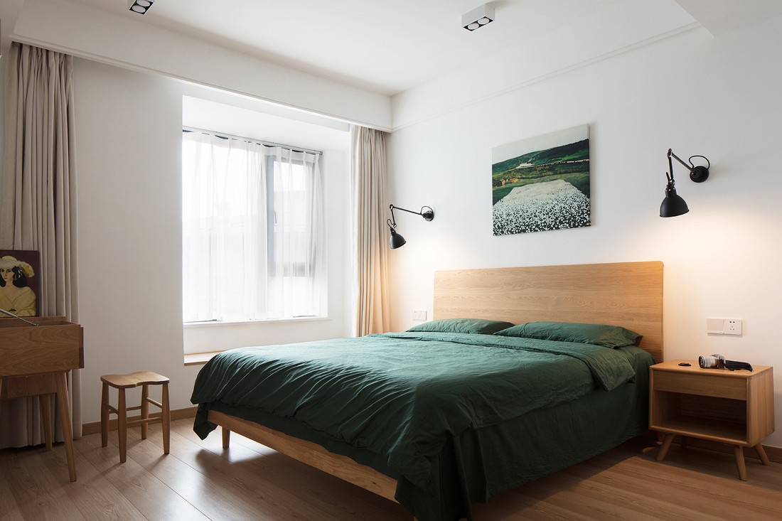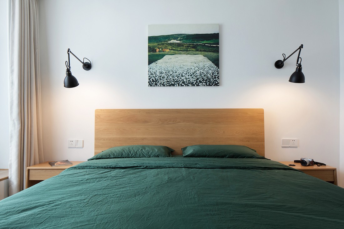 ▲主卧床头头选择了黑色伸缩灯,实用又方便且不占地方。墨绿色的床品瞬间提升了整个空间的层次感,米色窗帘搭配白色墙面让木质家具完美融合。卧室当然还是以休息为主啦,舒适才是第一位!